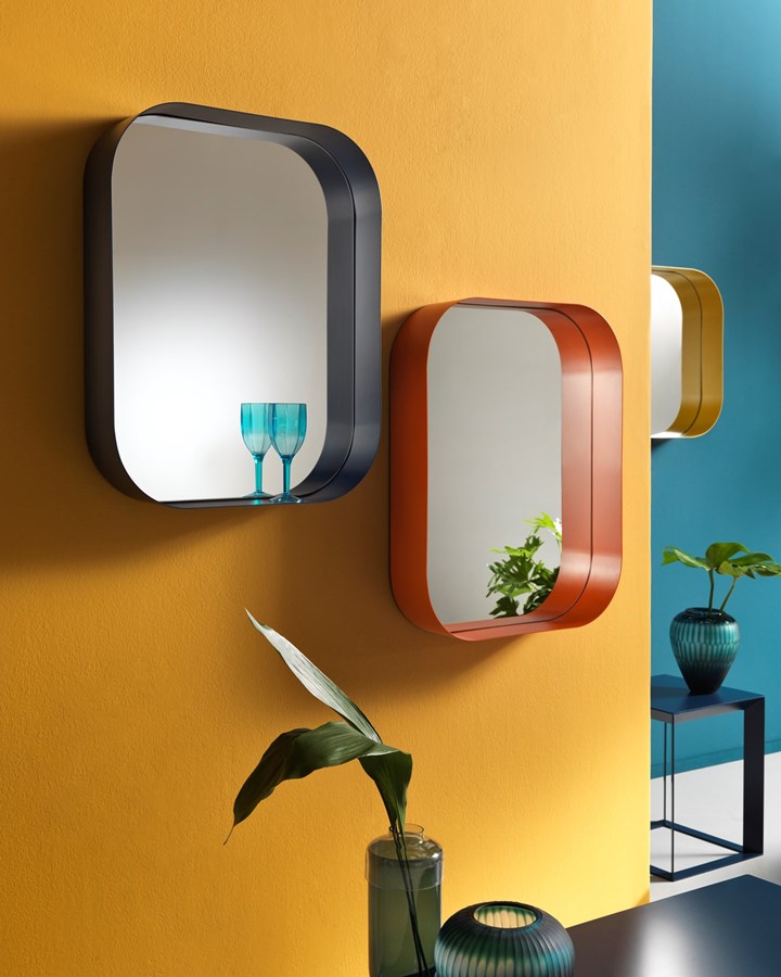 Зеркало Diletta сочетает в себе минимализм и яркость, доступно в различных цветах и имеет встроенную полку.