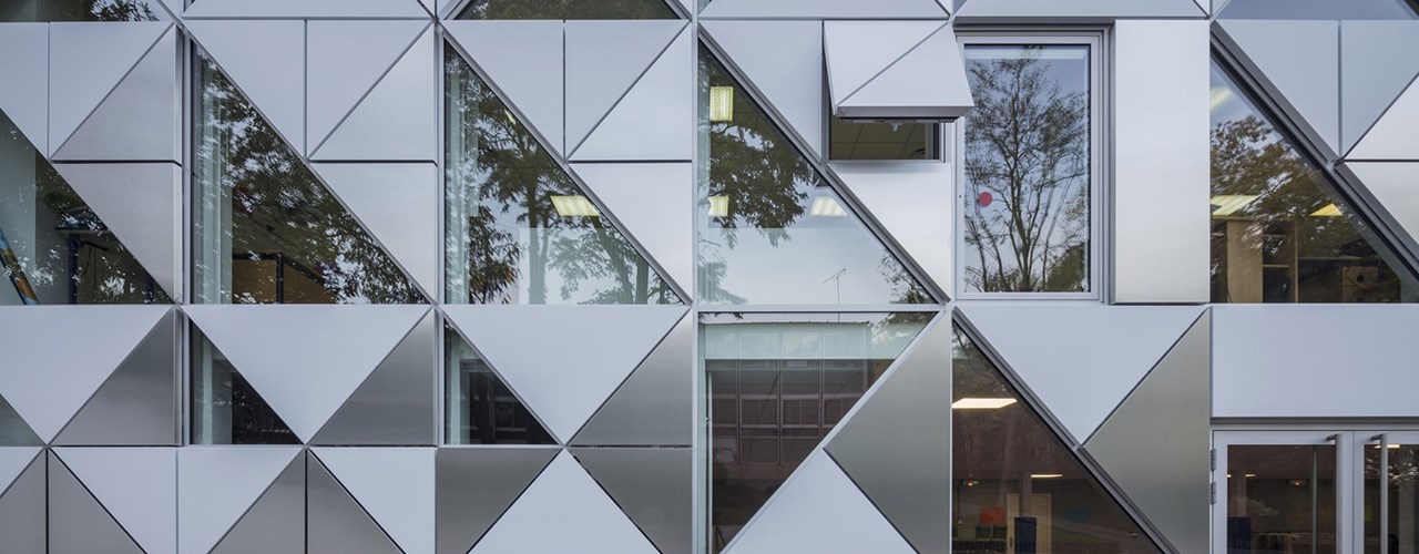 Футуристический дизайн с применением треугольных панелей ALUCOBOND® naturAL Brushed и белых панелей создает трехмерный эффект и гармонично вписывается в природный ландшафт.