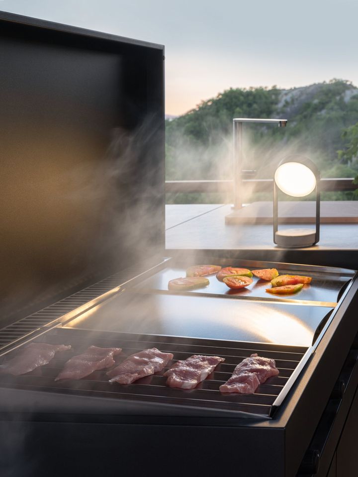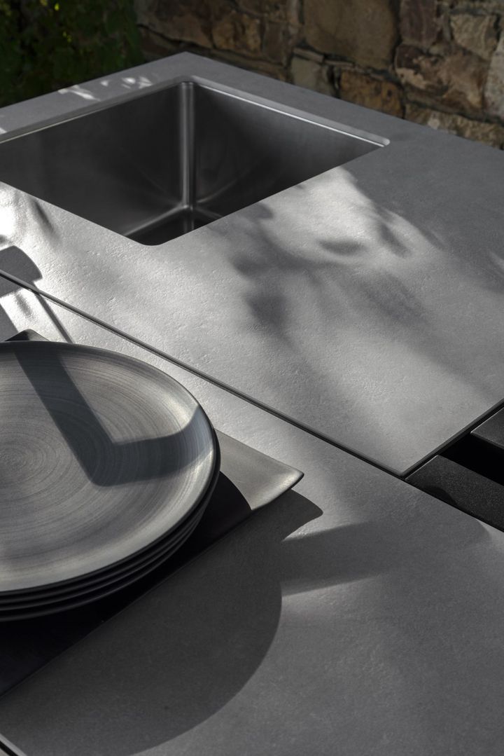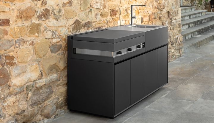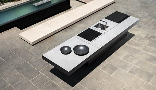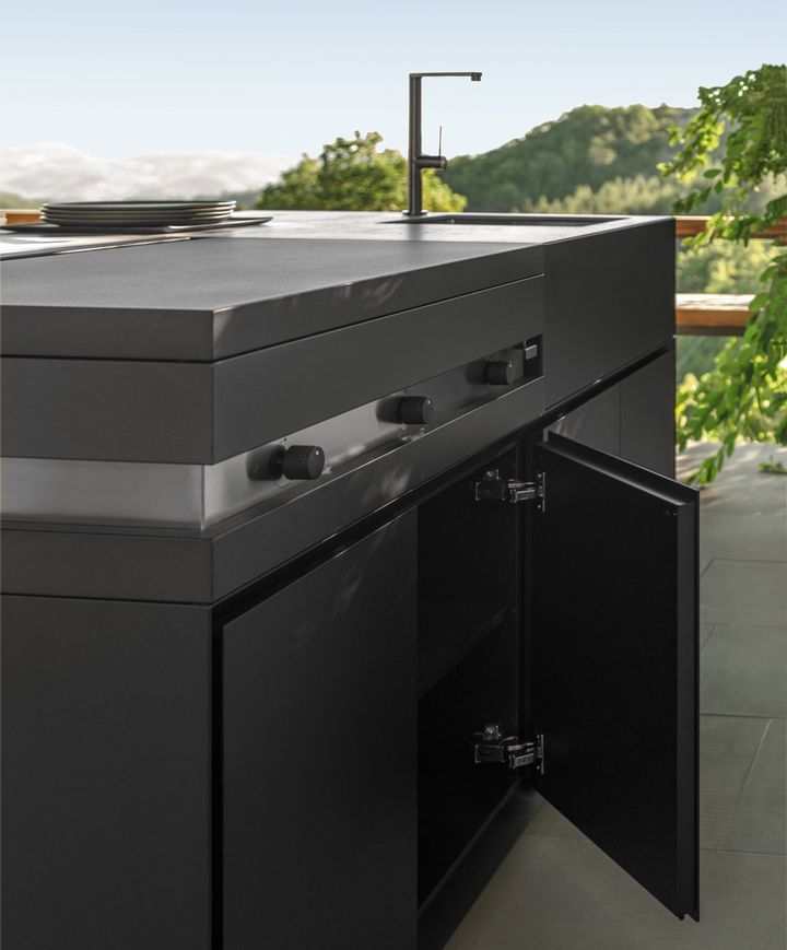 Компоненты линии Тикаль включают открытые и закрытые стеллажи, которые создают полноценное кухонное пространство на открытом воздухе.