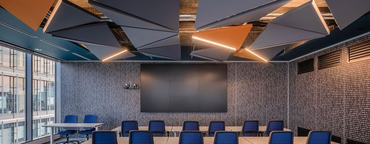 Линейка Sail с интегрированным освещением — это современное решение для офисов и конференц-залов. Панели Flag минимизируют реверберацию в зонах ресепшн, а модели Dot и Silente подходят для зон общего пользования.