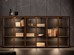Низкая деревянная и стеклянная офисная мебель с распашными дверями