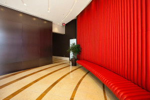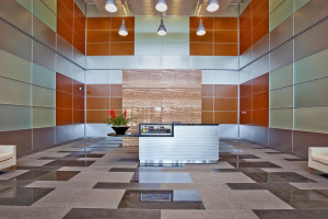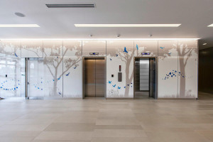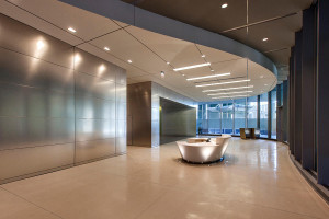FSRT665 Система облицовки стен Levele с глухими панелями из стекла vivichrome chromis с прослойкой индивидуального цвета и отделкой opalex, а также интерьеры лифтов levele-105 в корпоративном центре Mission City, сан-диего, калифорния Forms-surfaces