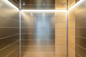 FSRT793 Интерьер лифта Levele-107 с основными панелями, облицованными шпоном дерева венге; акцентные панели из нержавеющей стали с льняной отделкой; панель лайтплана из стекла vivispectra elements с прослойкой юкки на частной территории Forms-surfaces