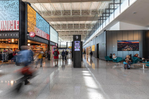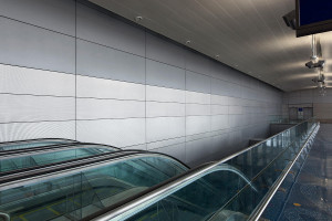 FSRT655 Система облицовки стен Levele флоат-панелями; нижние вставки из нержавеющей стали с отделкой из песчаника и оттиском по далласскому образцу; верхние вставки из окрашенного алюминия на заказ в поезд феникс скай, международный аэропорт феникс скай-г