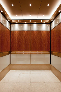FSRT780 Интерьер лифта Levele-106 с основными панелями, облицованными нестандартным деревянным шпоном; вивихромовое хромисовое стекло с прослойкой нестандартного цвета и стандартной отделкой; панели перил из плавленой бронзы, сатинированная отделка на час
