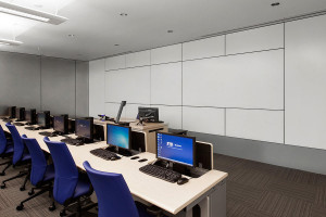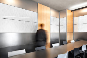 FSRT666 Система облицовки стен Levele глухими панелями; вставки из стекла vivispectra Spectrum, прослойка нестандартного изображения, стандартная отделка, стекло vivichrome chromis, белая прослойка, стандартная отделка; перегородка и дверь со стеклом vivi