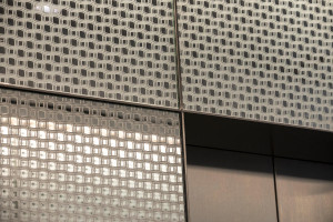 FSRT631 Деталь выравнивающей системы облицовки стен с панелями из вивистрата, слоями стекла в отражающей конфигурации с индивидуальным вытравленным рисунком и стандартной отделкой, а также выступами из нержавеющей стали в Frost Tower, Сан-Антонио, Техас F