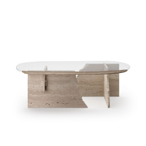 Овальный журнальный столик из травертина и стекла