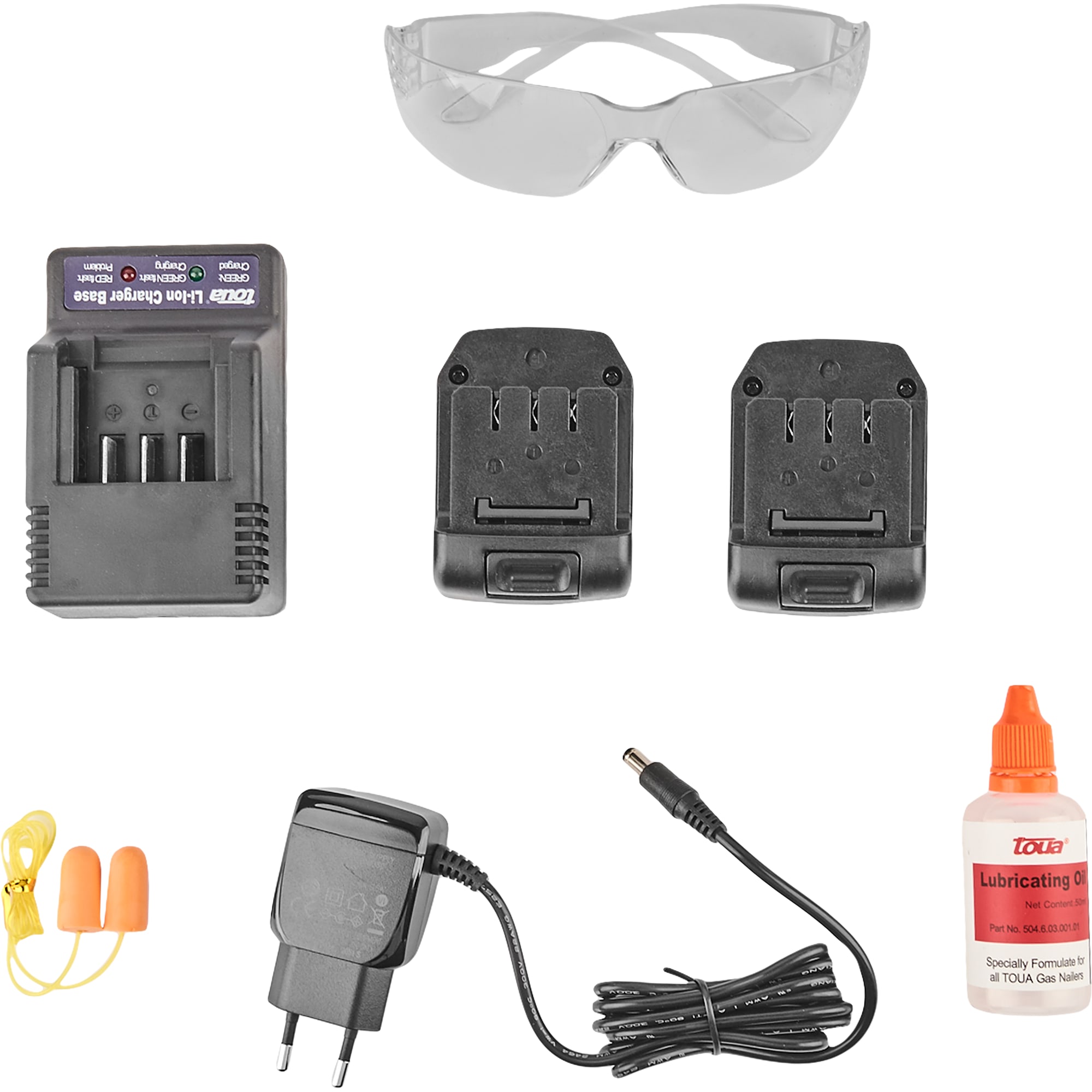 Аксессуары в комплекте Нейлер -1 шт, Аккумуляторная батарея -2 шт, Зарядное утсройство-1, адаптер AC-DC - 1 шт, Кейс пластиковый -1 шт, Мягкая насадка на ствол- 1 шт, Инструкция -1 шт