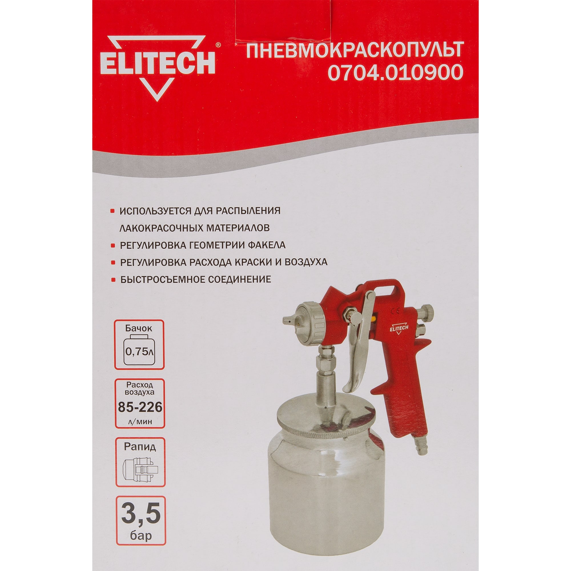 Пневматический краскораспылитель Elitech обеспечивает равномерное нанесение покрытий методом распыления с высокой эффективностью переноса материала.