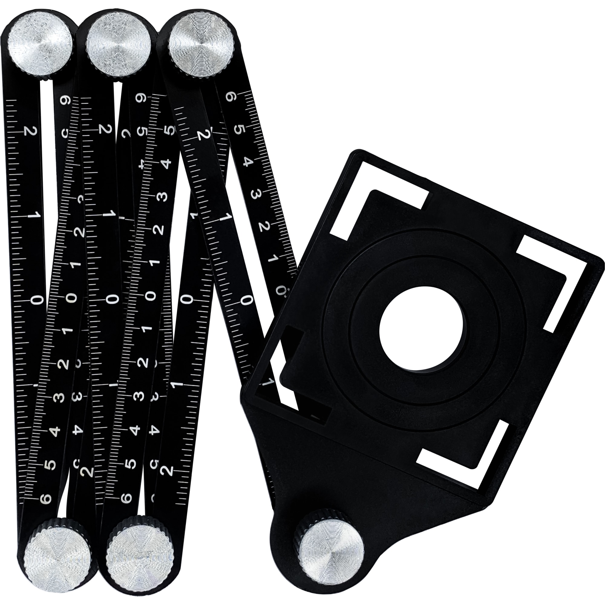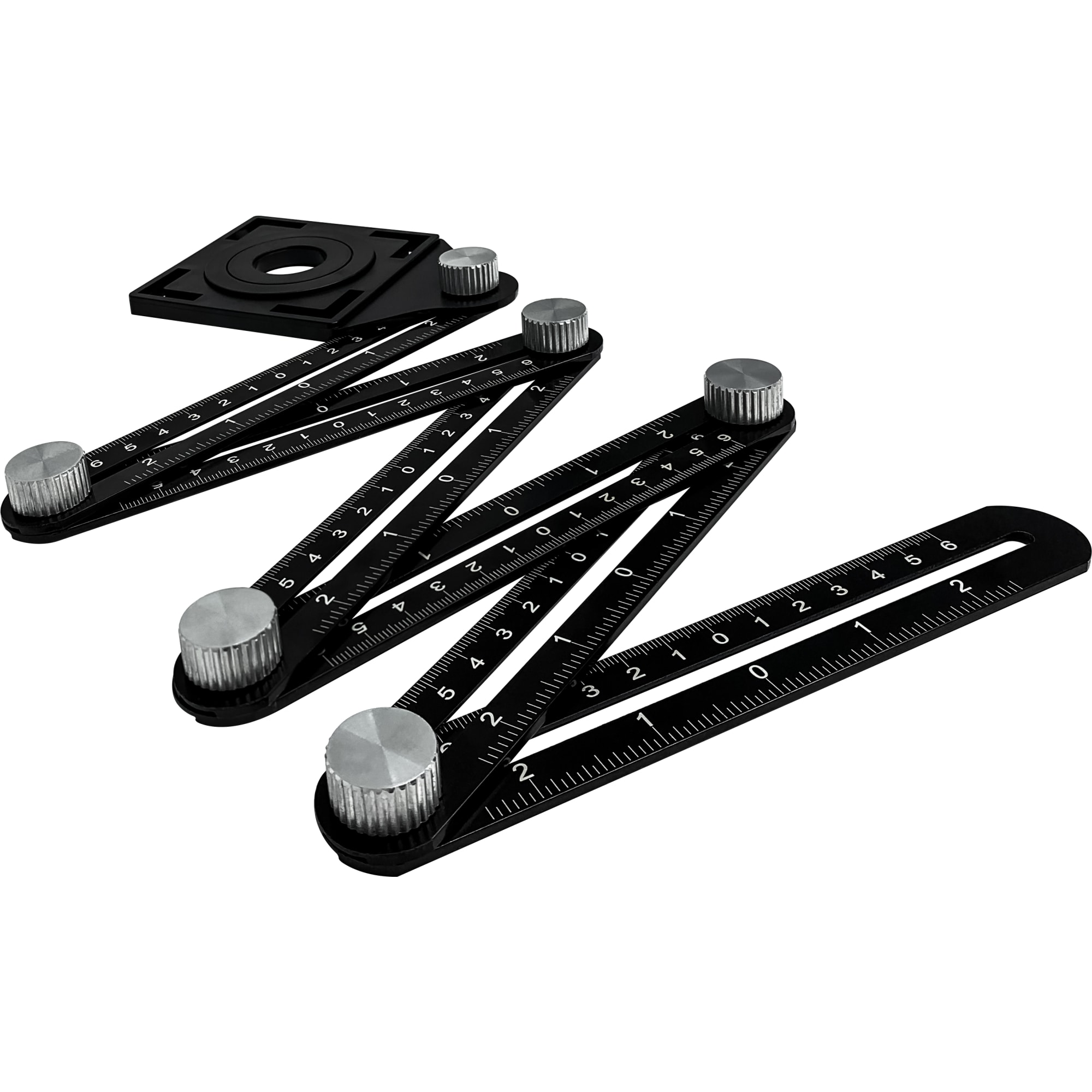 **Линейка-шаблон Vertextools** предназначена для точного переноса отверстий. Используется при строительных работах по дереву, для проектирования и рисования. Углы регулируются при помощи специальных винтов. # Особенности: - имеет 6 секций; - длина — 180 мм.