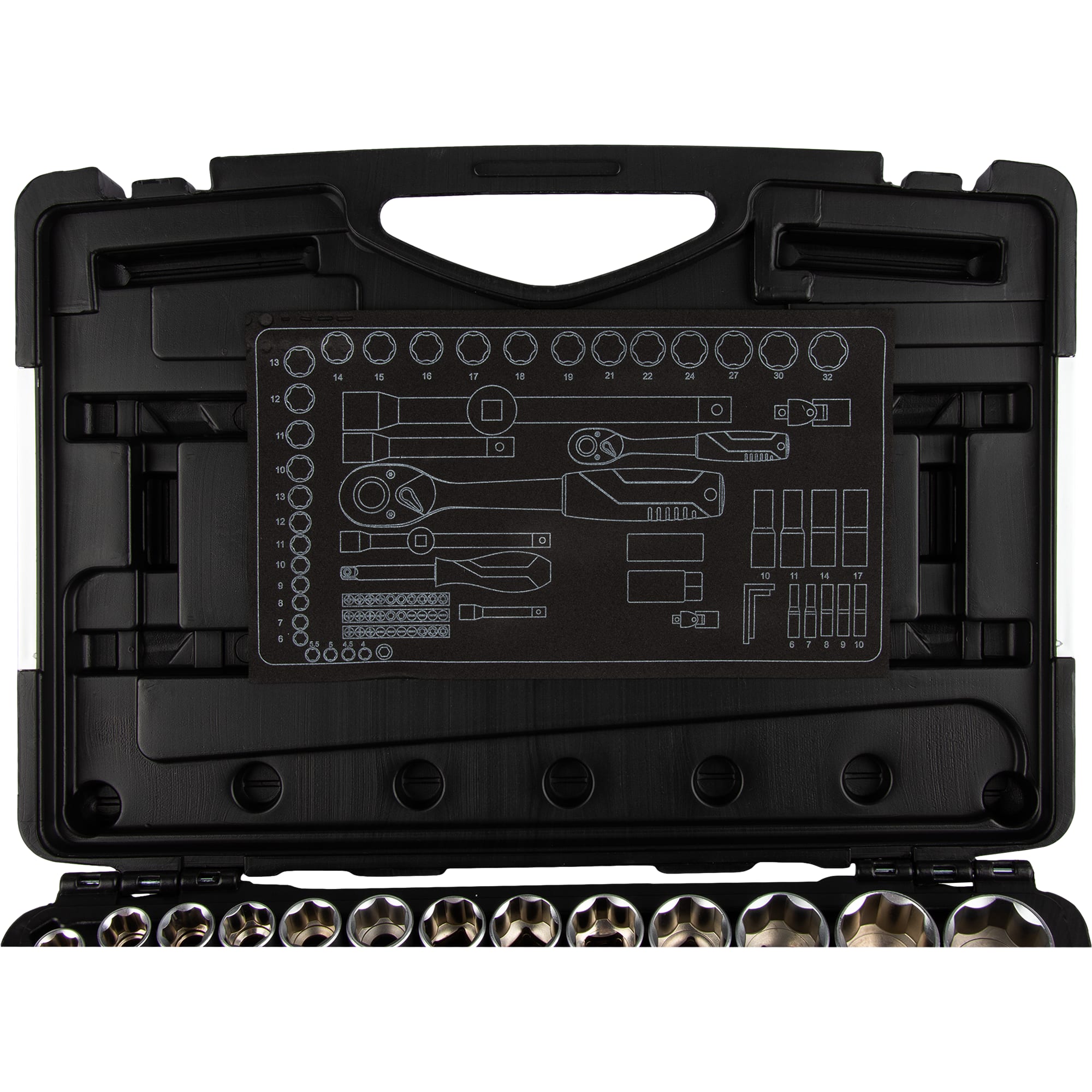 Состав комплекта 2 ключа с храповым механизмом, 150 мм 1/4 дюйма и 250 мм 1/2 дюйма. 28 шестигранных головок, 1/4 дюйма, 4 мм, 4,5 мм, 5 мм, 5,5 мм, 6 мм, 7 мм, 8 мм, 9 мм, 10 мм, 11 мм, 12 мм, 13 мм. 1/2 дюйма, 10 мм, 11 мм, 12 мм, 13 мм, 14 мм, 15 мм, 16 мм, 17 мм, 18 мм, 19 мм, 21 мм, 22 мм, 24 мм, 27 мм, 30 мм и 32 мм. 2 удлинителя 1/4" 50 мм и 1/2" 125 мм. 11 удлиненных головок 1/4", 6, 7, 8, 9, 19 мм и 1/2 дюйма, 10, 11, 14, 16, 17, 21 мм. 4 шестигранных ключа. 32 насадки-отвертки. держатель бит 1/4 дюйма