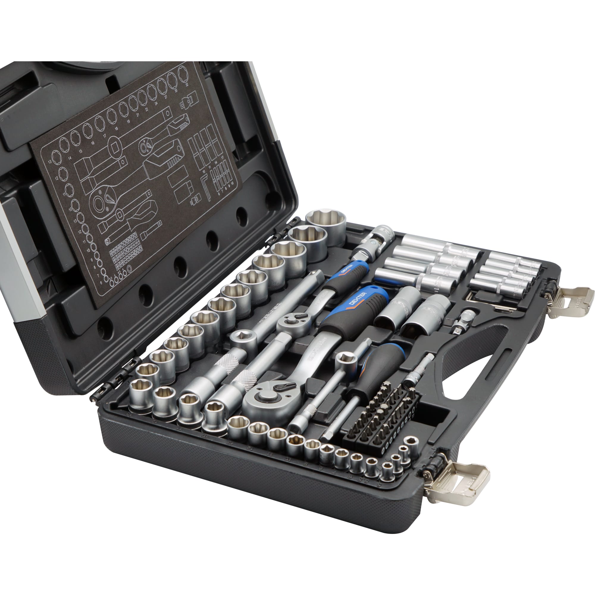 Набор головок Dexter предлагает комплексное решение для бытового и профессионального использования с 85 надежными элементами в удобном кейсе.