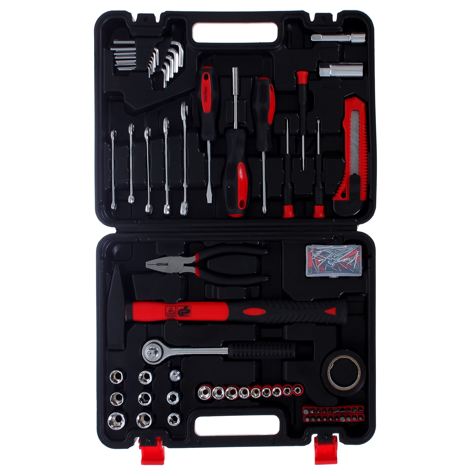 | Состав комплекта | комбинированные гаечные ключи с трещоткой, воротки, удлинители, отвертки, нож с сегментированным лезвием, большой молоток и плоскогубцы, торцевые головки на 3/8" и 1/8", гвозди, дюбели, насадки и адаптеры, упаковка изоляционной ленты. |
