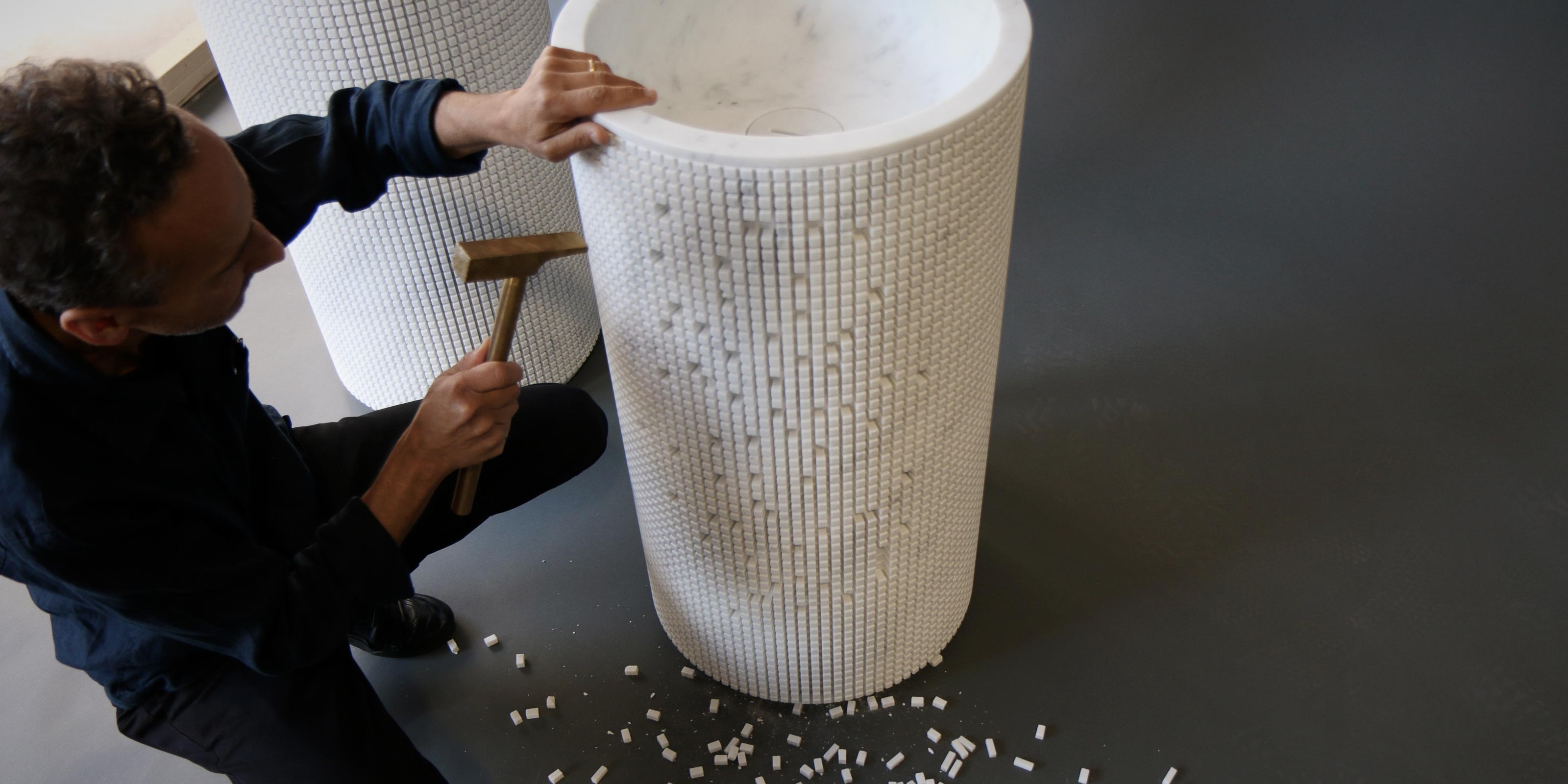 От древнейшего материала до иллюзии формирования нематериального, от скульптурной традиции «округлых» форм до разделения на мелкие части поверхности для создания объема, который является выражением «вычитания» множества мелких деталей. . Название говорит само за себя: пиксель - это точечный элемент, составляющий цифровое изображение, по сути, это самый маленький элемент, из которого оно состоит. Разбивка на отдельные пиксели поверхности, своего рода трехмерная мозаика, дает беспрецедентный взгляд на мраморную раковину Pixel. Форма создается путем вычитания, идея человека, которая воплощается в жизнь с помощью машины, которая затем снова определяется выбором человека. Традиция встречается с технологией в разложенной стандартизированной форме, разделенной на секции, пересекаемой ортогональной решеткой, в цилиндрическом объеме. на котором машина нанесла четкий и определенный знак в соответствии с проектом, который оставляет открытыми безграничные возможности композиции. Отдельностоящая, постоянно меняющаяся мойка за счет исключения деталей может обретать форму воображения, раскрывается изображение, раскрывается суть. Свет и тень, глубина и рельефы, комбинации и расстояния, соединения и изоляция. Пиксельная игра, которая формирует бассейн, полностью ориентирована на последовательность, на близость, на приличие, исходящее от самого материала. Жест вычитания, раскрывающий форму, который позволяет настраивать объем и усиливает трехмерный дизайн проекта. Пиксель - это вычитание для композиции.