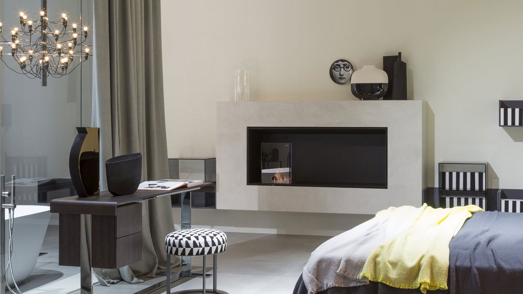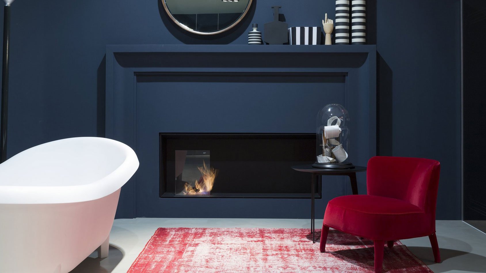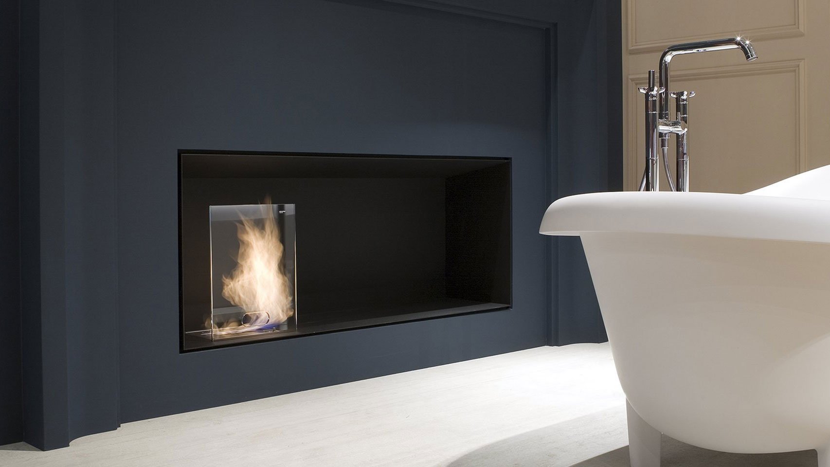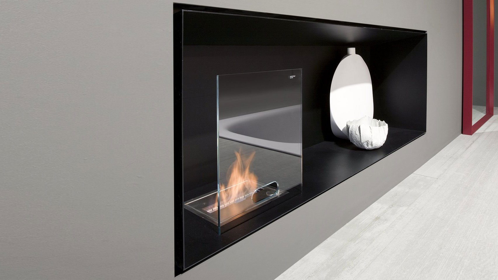 Тека выглядит как трехмерная современная картина, содержащая такой исконный элемент, как огонь. Это закрытый этаноловый камин, окантованный стеной каркас. Его минималистичная структура играет роль фонового пейзажа, и в нем установлена ​​горелка для этанола. Закрытый камин на этаноле производится в соответствии с требованиями заказчика и помещения и может включать в себя также другие функции.