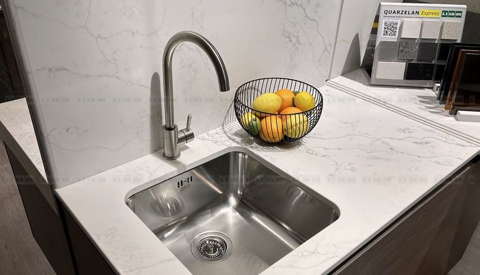 Quarzelan от Ligron — это кварцевый композитный материал, который на 95 % состоит из кристаллов натурального кварца. К кварцу добавляются высококачественные экологически чистые минеральные красители и полимерные смолы. Для получения более эксклюзивных и эффектных декоров добавляются мелкие кусочки стекла или зеркальные кристаллы. Впоследствии из данной смеси получаются плиты путём уплотнения методом вибрации под вакуумом. Таким образом Quarzelan сохраняет присущую кварцу твёрдость и своим видом полностью имитирует натуральный кварц, как внешне, так и на ощупь. При этом Quarzelan обладает исключительными свойствами, превосходящими все другие материалы, используемые для изготовления столешниц.Quarzelan очень устойчив против царапин и ударов, отталкивает грязь и бактерии, жароустойчив. В отличие от гранита и мрамора поверхность Quarzelan не пористая, поэтому различные химикаты и кислоты, фруктовые соки и вино не могут проникать внутрь и таким образом разрушать поверхность или вызывать изменение цвета. В повседневном применении поверхность Quarzelan не требует никакого специального ухода. Quarzelan - великолепный материал для изготовления кухонных столешниц и столешниц в ванные комнаты.