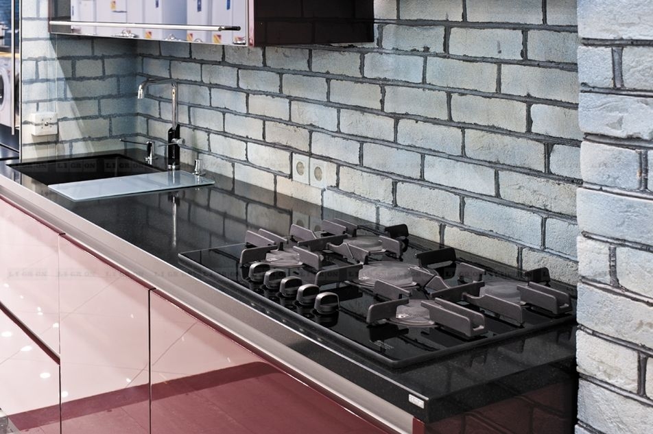 Обладает высокой теплостойкостью, стеновые панели можно размещать непосредственно за газовой варочной панелью. При этом ставить горячее на поверхность кварца нерекомендуется.