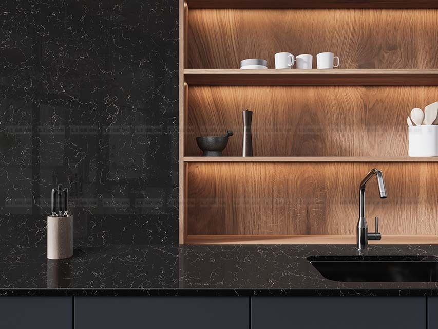 Обладает высокой теплостойкостью, стеновые панели можно размещать непосредственно за газовой варочной панелью. При этом ставить горячее на поверхность кварца нерекомендуется.