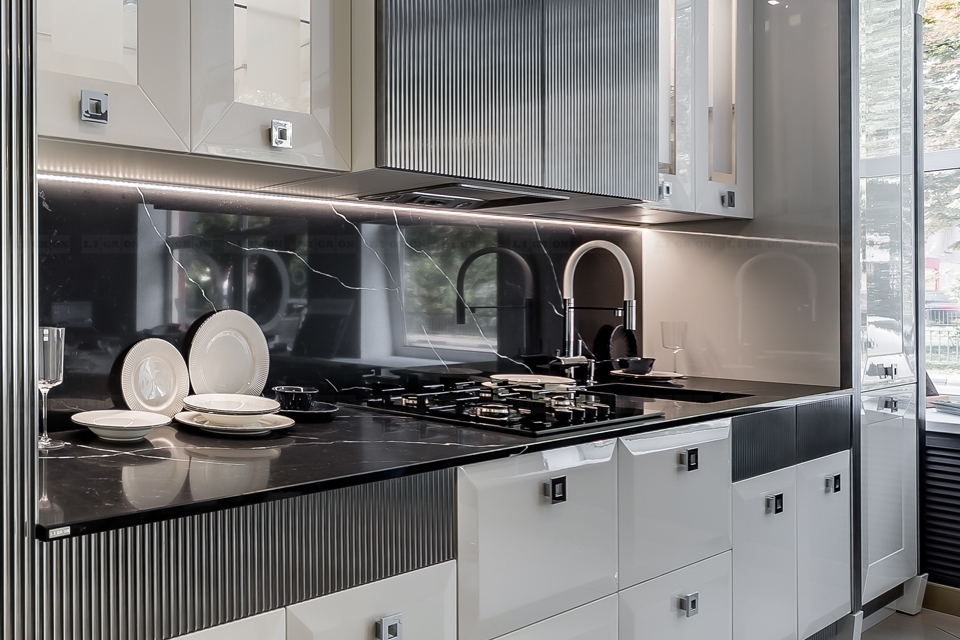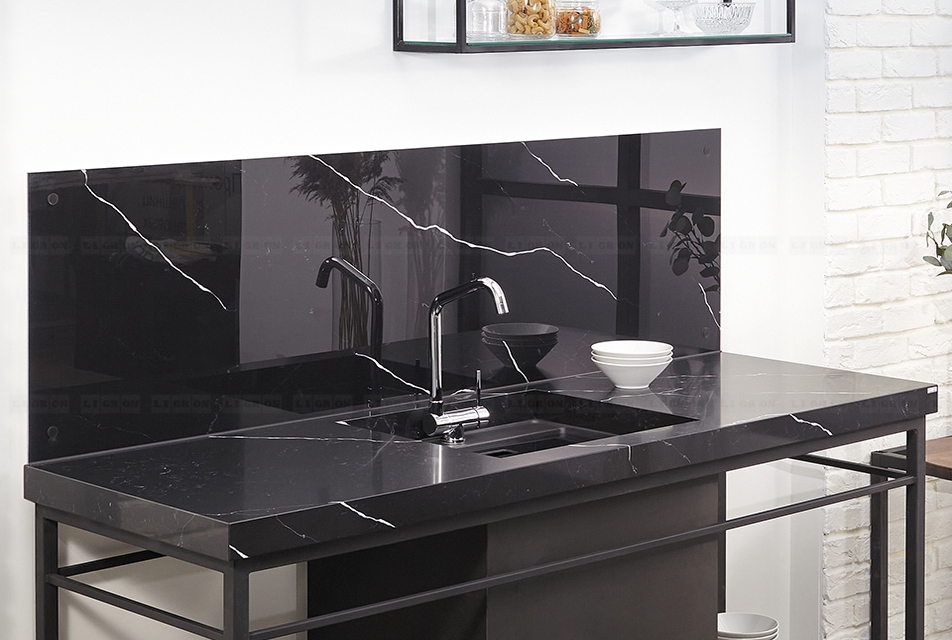 Поэтому имеются ограничения на изготовление столешниц с радиусами. Однако, LIGRON умеет обрабатывать кварцелан и изготавливать из него столешницы и стеновые панели с фигурными классическими профилями.