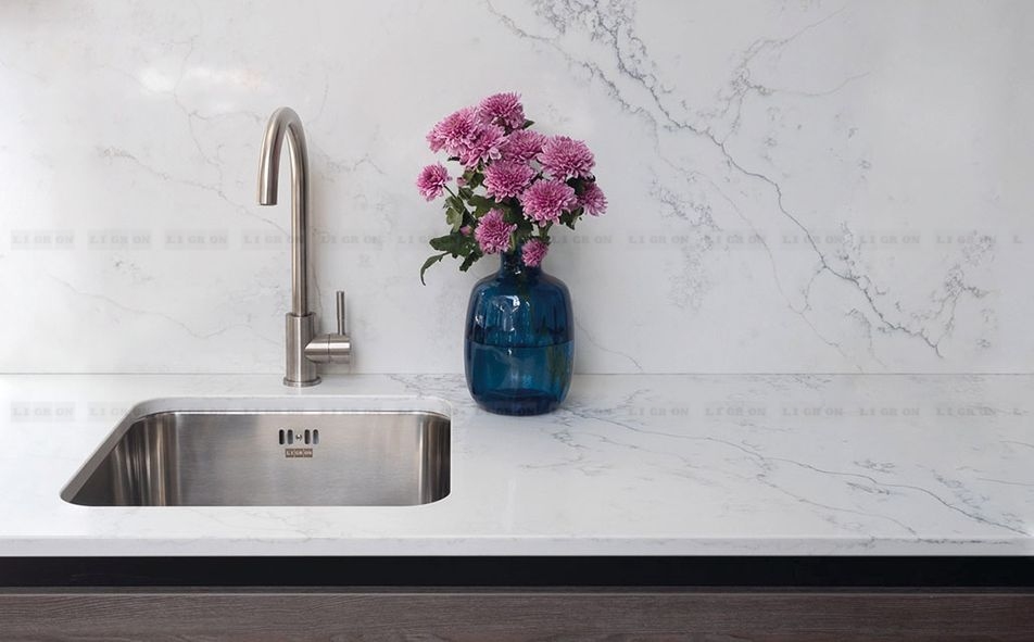 Quarzelan от Ligron — это кварцевый композитный материал, который на 95 % состоит из кристаллов натурального кварца. К кварцу добавляются высококачественные экологически чистые минеральные красители и полимерные смолы. Для получения более эксклюзивных и эффектных декоров добавляются мелкие кусочки стекла или зеркальные кристаллы. Впоследствии из данной смеси получаются плиты путём уплотнения методом вибрации под вакуумом. Таким образом Quarzelan сохраняет присущую кварцу твёрдость и своим видом полностью имитирует натуральный кварц, как внешне, так и на ощупь. При этом Quarzelan обладает исключительными свойствами, превосходящими все другие материалы, используемые для изготовления столешниц.Quarzelan очень устойчив против царапин и ударов, отталкивает грязь и бактерии, жароустойчив. В отличие от гранита и мрамора поверхность Quarzelan не пористая, поэтому различные химикаты и кислоты, фруктовые соки и вино не могут проникать внутрь и таким образом разрушать поверхность или вызывать изменение цвета. В повседневном применении поверхность Quarzelan не требует никакого специального ухода. Quarzelan - великолепный материал для изготовления кухонных столешниц и столешниц в ванные комнаты.