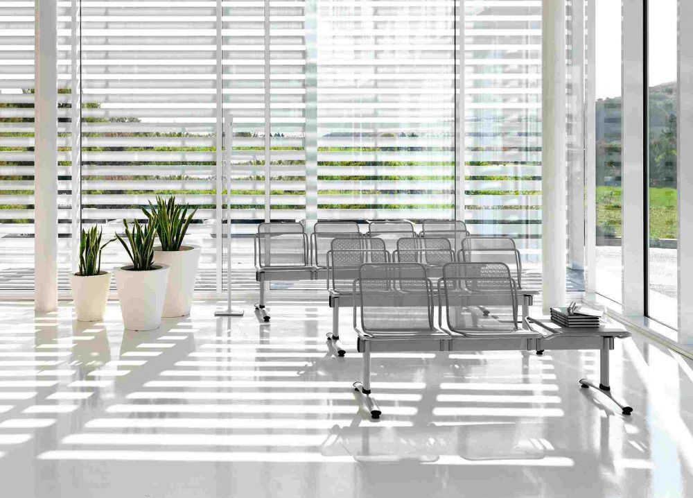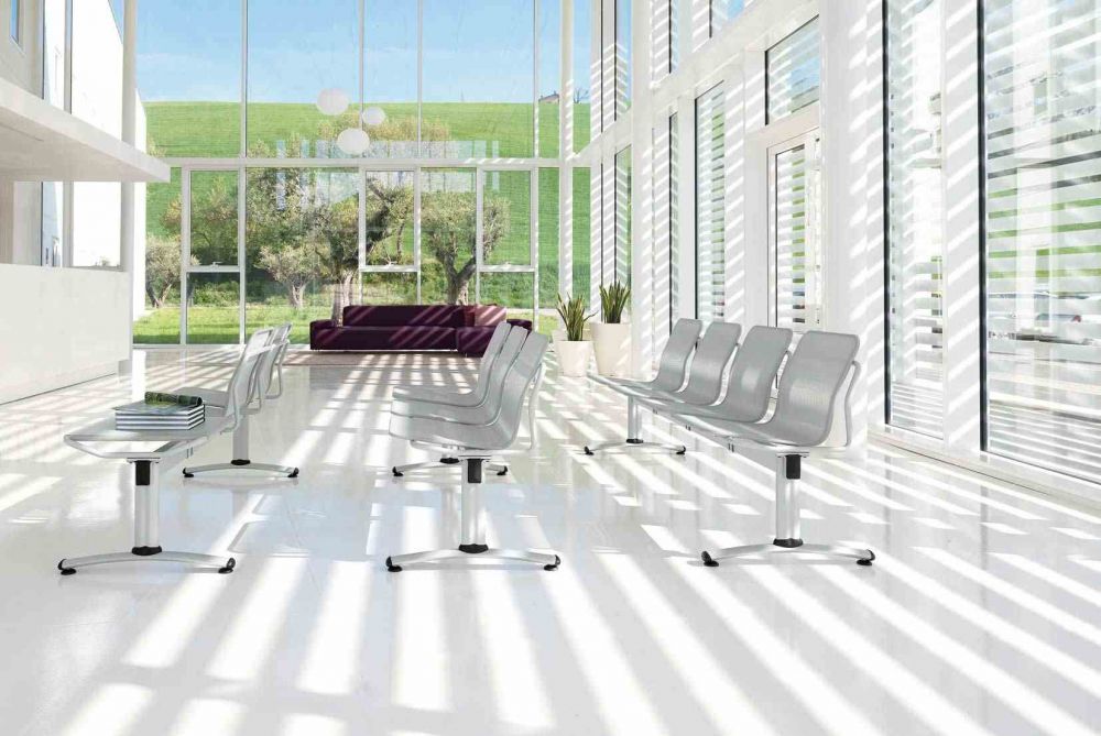 Стулья для залов ожидания, табуреты индивидуальные или на 2-5 мест. Каркас из перфорированного металла, сиденье и спинка с мягкой обивкой.